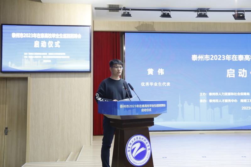 金年会app2023届黄伟同学作为留泰优秀毕业生代表发言,他目前在泰州一家新能源科技有限公司实习,泰州美好的宜居环境、便利的交通和暖心的人才关怀让他毕业后选择留泰就业。