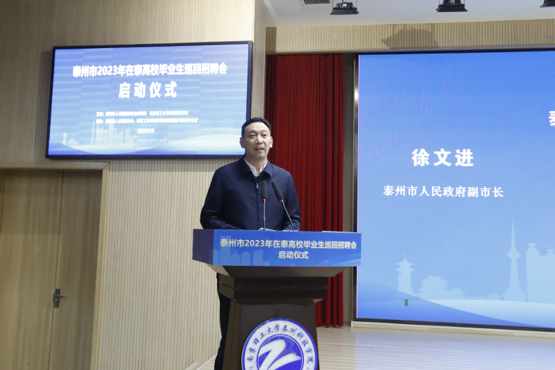 会上,徐文进在讲话中表示,泰州历来是江淮地区经济重镇,也是长三角发展最快的城市之一。市委、市政府历来重视人才工作,提出“要把泰州打造成青年和人才向往的机遇之城、幸福之城”。这里有“泰爱才”的情怀、“泰给力”的政策、“泰贴心”的服务,希望同学们能够留下来,与泰州一起双向奔赴,共同成长、共同发展。