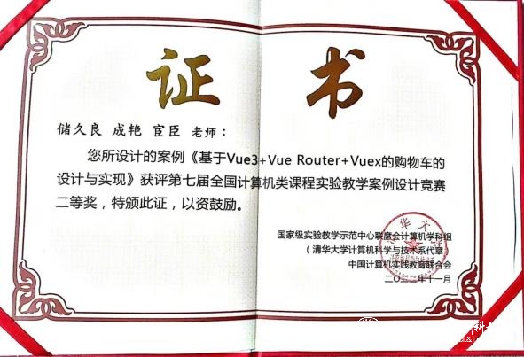 来自全国高校的数百位实践教学教师参加了本次论坛,论坛围绕计算机实践测验教学与创新实践人才培养这一主题,从优质计算机测验教学资源的整合与共享、计算机实践测验平台建设、计算机实践能力培养、产教融合协同育人、计算机实践测验教育内涵建设等角度进行分享、交流与研讨。我校储久良教师代表团队参加线上学术交流会议。在本次论坛举行的第七届全国计算机类课程测验教学案例设计竞赛中,由计算机科学与工程学院“Web前端框架技术教学团队”储久良、成艳、宦臣等老师所设计的《基于Vue +Vue Router+Vuex的购物车的设计与实现》荣获二等奖。另外,由金年会app储久良教师编著的《Web前端开发技术--HTML5、CSS3、JavaScript(第4版)》、《Web前端开发技术测验与实践--HTML5、CSS3、JavaScript(第4版)》被评为国家级测验教学示范中心计算机学科组“十四五”规划教材。
