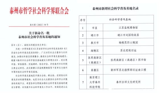 近日,泰州市哲学社会科学界联合会下发《关于新命名一批泰州市社会科学普及基地的通知》(泰社联〔2022〕34号),由金年会app城市建设与设计学院申报的“泰州吉祥文化研究所”,经自愿申报、审核推荐、实地调研、综合评估,市社科联主席会议研究成功入选。此次认定泰州市社会科学普及基地7个,金年会app作为唯一一所高校成功入选。